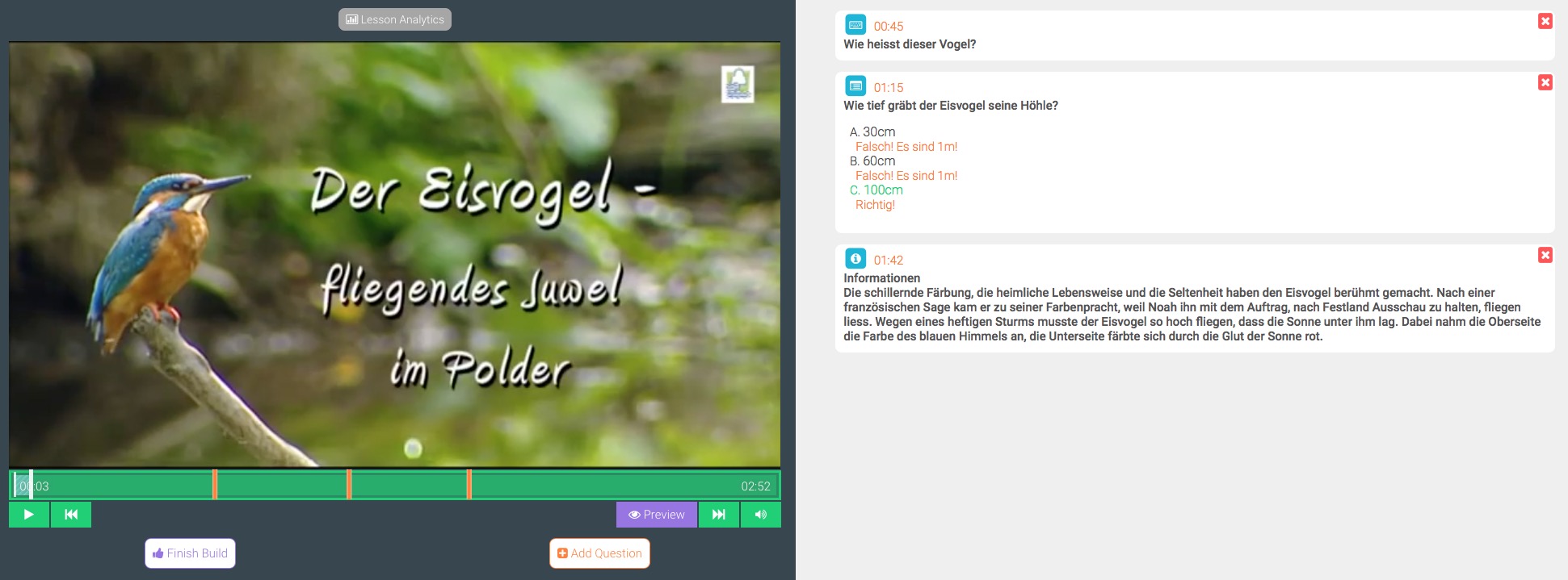 - Fragen sollten nicht unmittelbar nach der Erklärung im Video kommen. Besser ist es, einige Zeit verstreichen zu lassen, das erhöht den Erinnerungswert und auch die Aufmerksamkeit. Ausserdem können dann nicht Videoteile übersprungen werden und nur die Passagen knapp vor der Fragestellung angeschaut werden. Das Programm erlaubt auch jederzeit, dass die Position der Fragen nachträglich geändert werden kann. Dazu muss an die neue Stelle im Video gesprungen werden, die didaktische Interaktion zum Editieren geöffnet werden und mit der neuen angezeigten Zeit (links statt rechts unten) wieder gesichert werden.